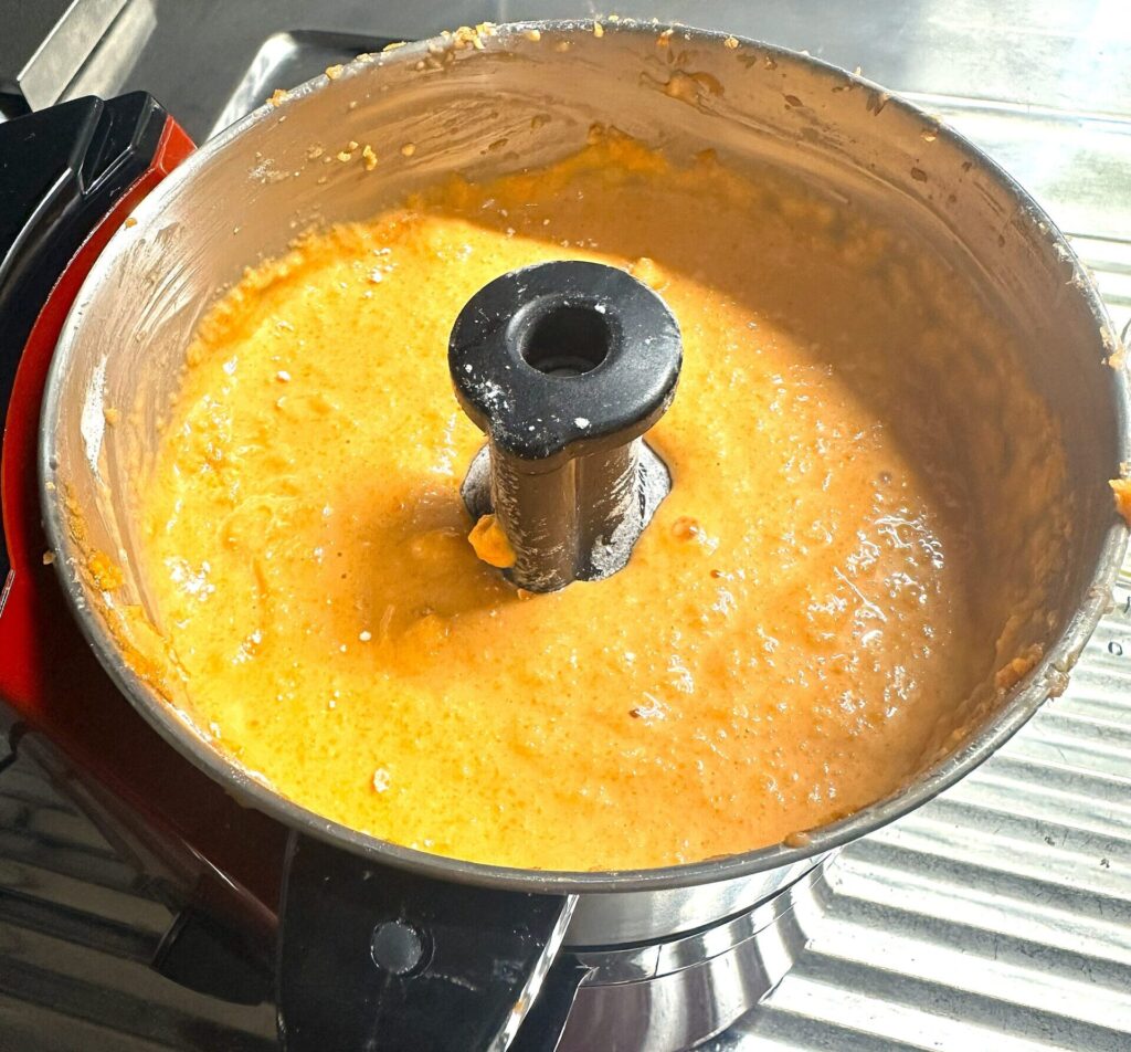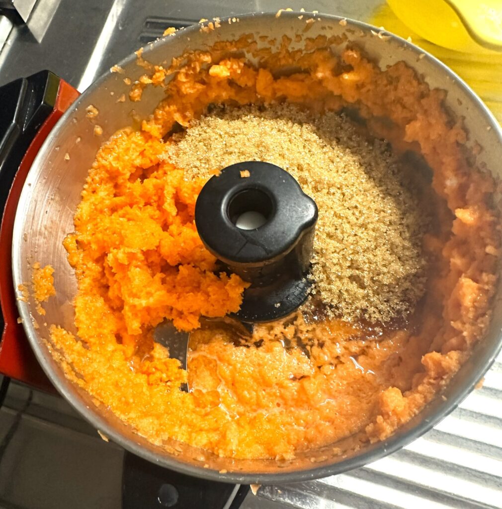 ② ①のにんじんが入ったままのフープロのブレードを混ぜる用に変えて 卵、砂糖、油を入れて混ぜる。