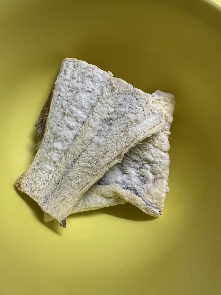 ①干しだらを水で戻す(最初は塩がたっぷりついてカッチカチの状態です。)
