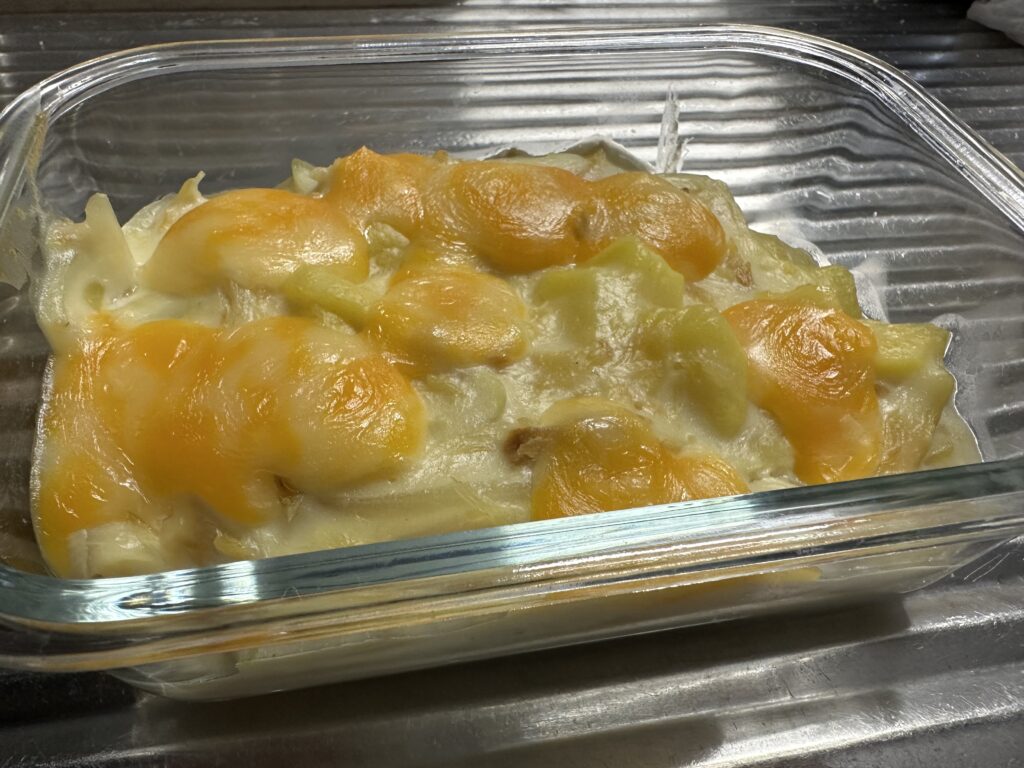 ⑨とろみがついたら火を止めて耐熱皿に入れ、トースターでチーズが溶けるまで焼く。