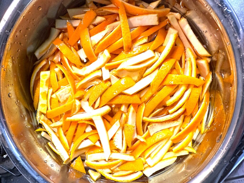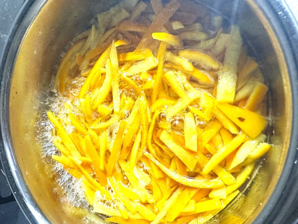 ③皮を15分くらい茹でこぼす。途中で味見して、柔らかさと苦さを確認する。