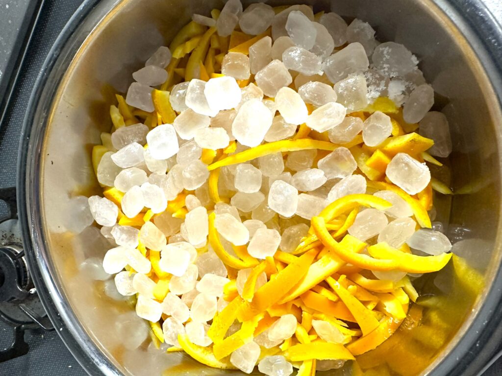 ④お湯を一度全て捨てる。皮が浸かるくらいまで水を入れ、砂糖全量投入して中火で煮る。