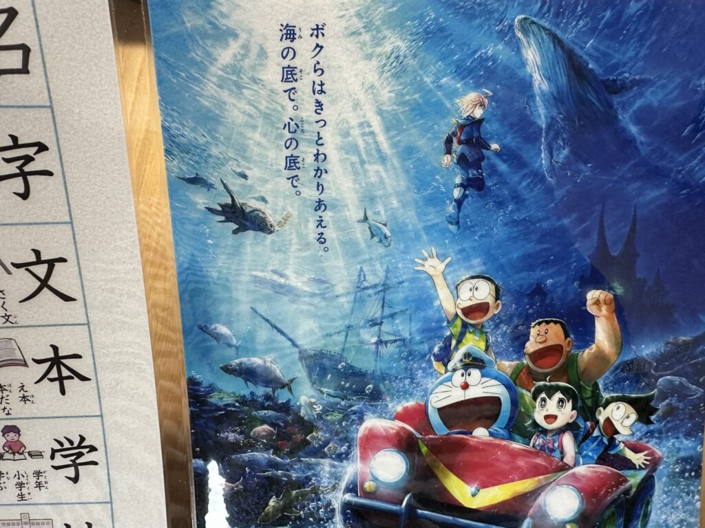 ラミネートフィルムがA3しかなかったので、漢字と一緒にどらえもんのチラシをラミネートしました。
